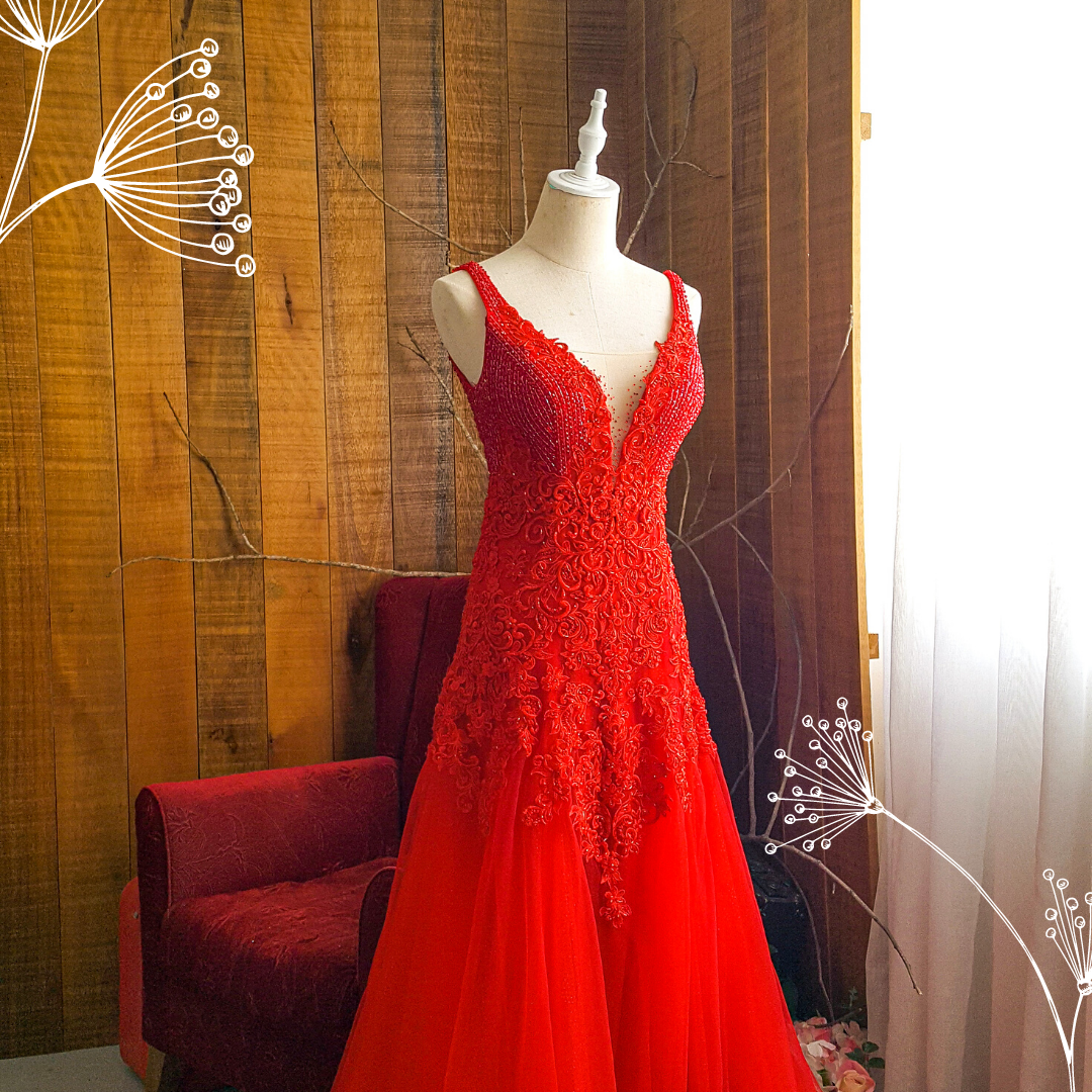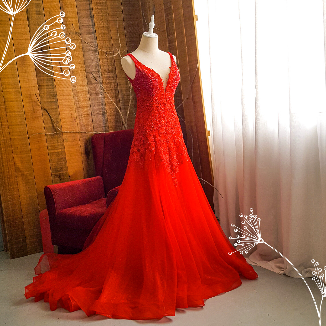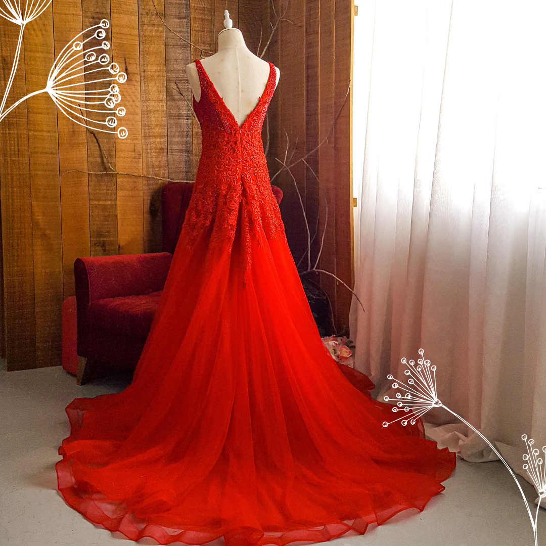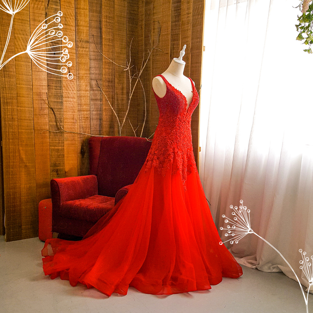 204LLE03 Saddie Red Deep V embellished bodice A line a Bride Wedding Event Reception Dinner Dress rental Malaysia