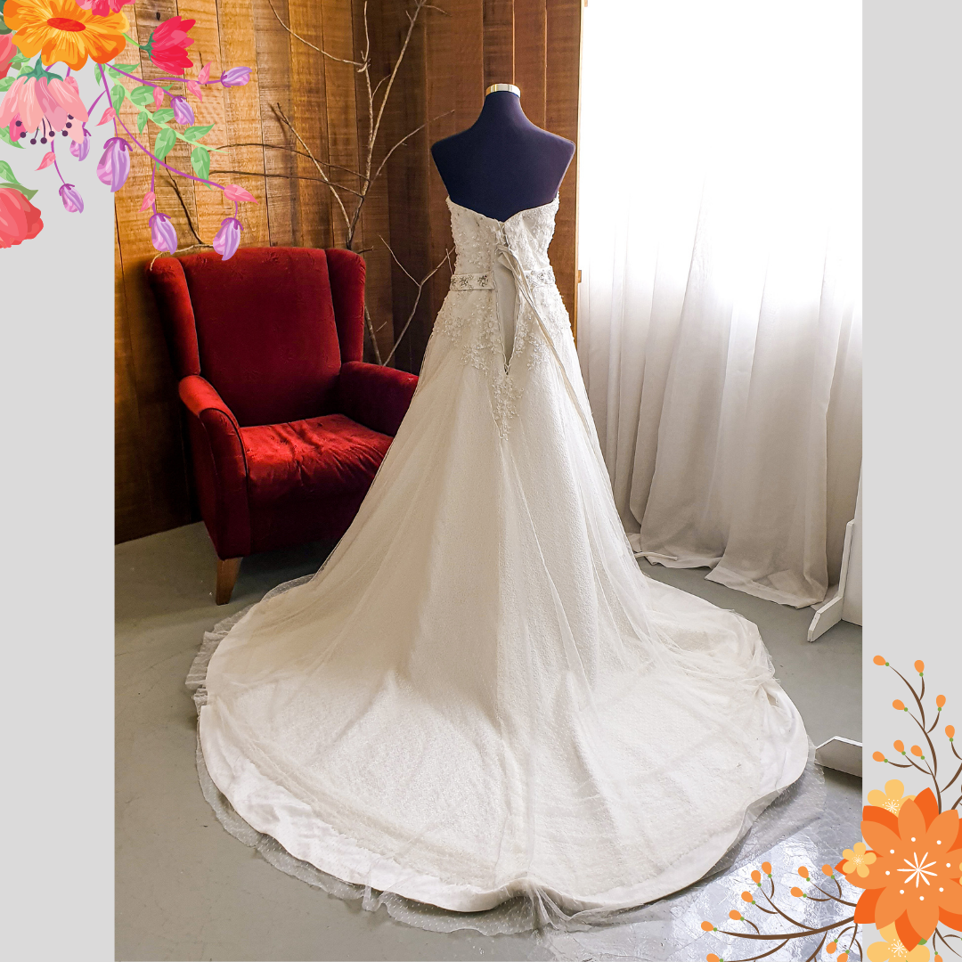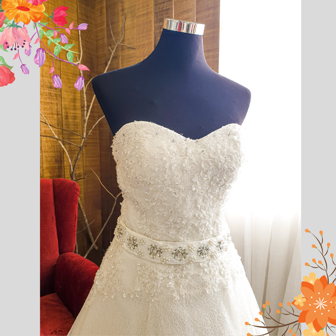 Featuring a beautiful lace embroidery with elegant beading details, this gorgeous wedding dress is both elegant and timeless!