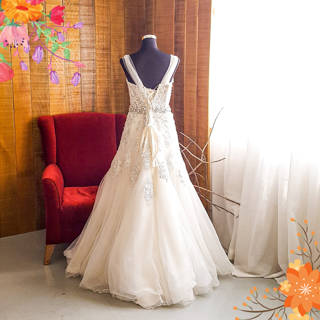 Featuring a beautiful lace embroidery with elegant beading details, this gorgeous wedding dress is both elegant and timeless!