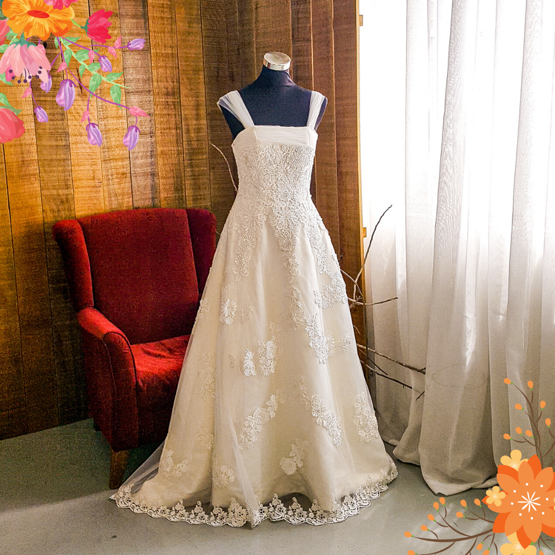Featuring a beautiful lace embroidery with elegant beading details, this gorgeous wedding dress is both elegant and timeless!