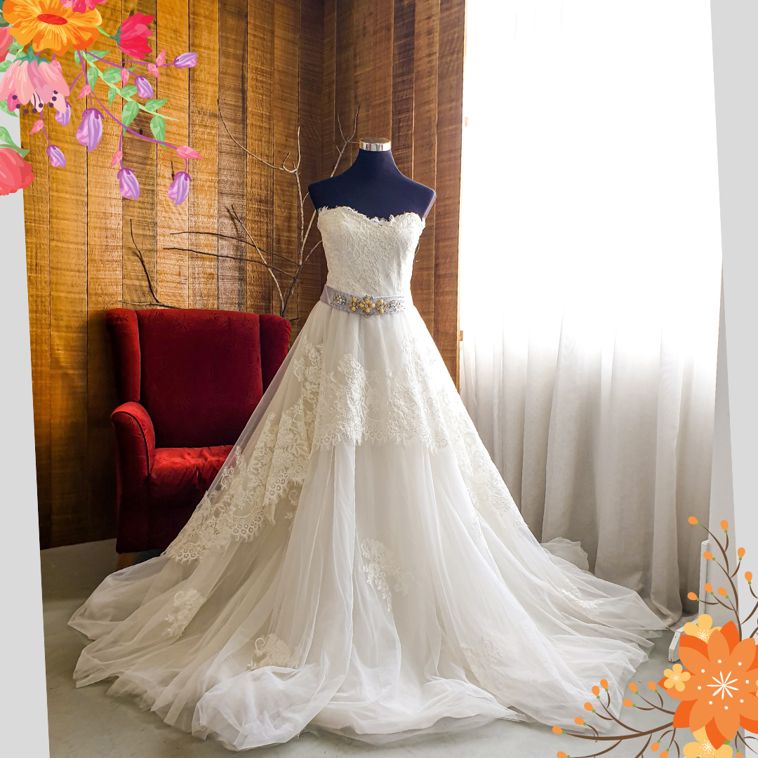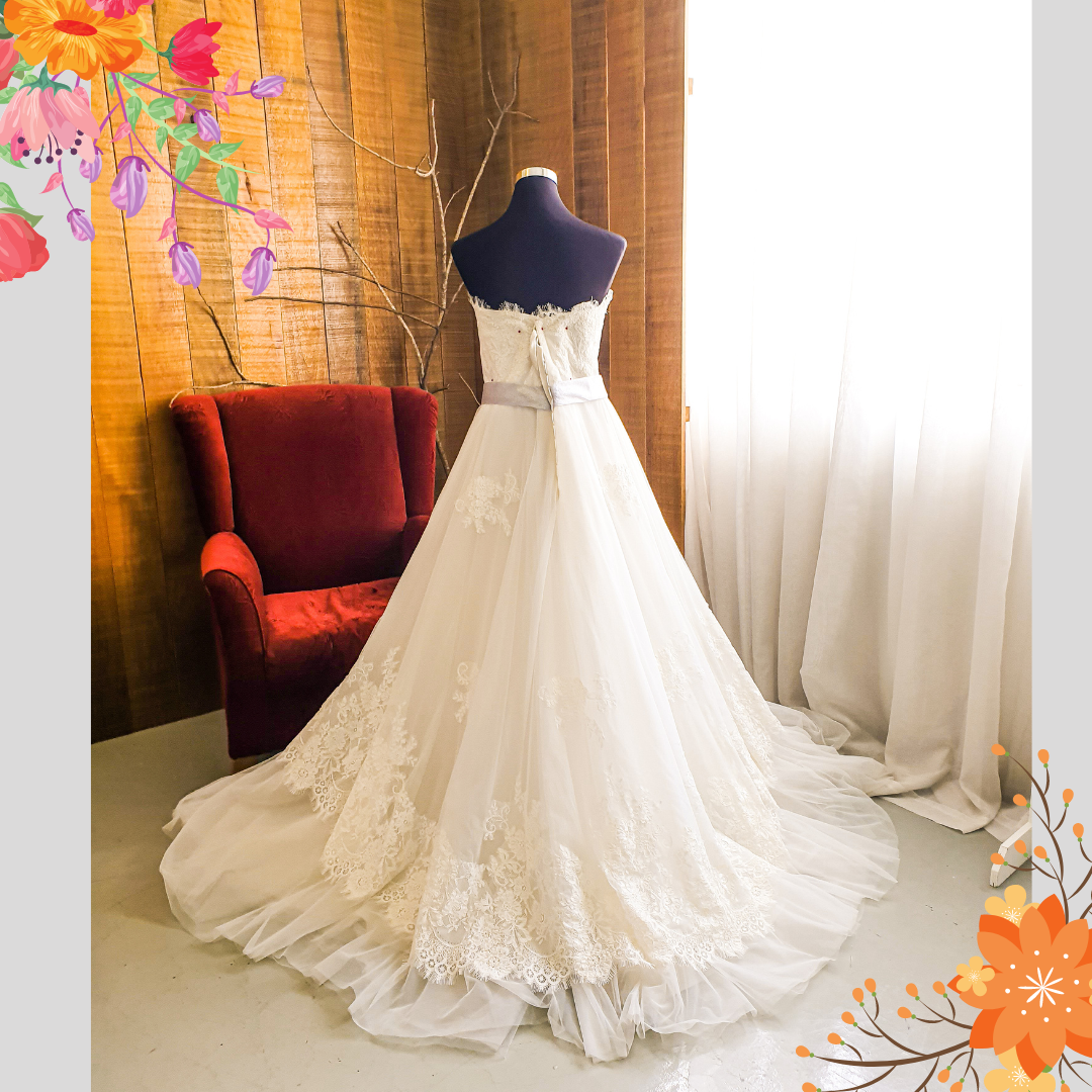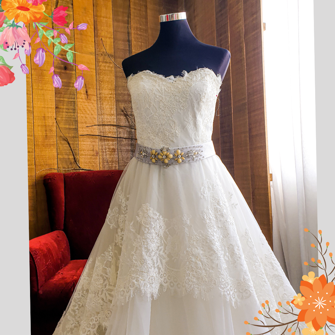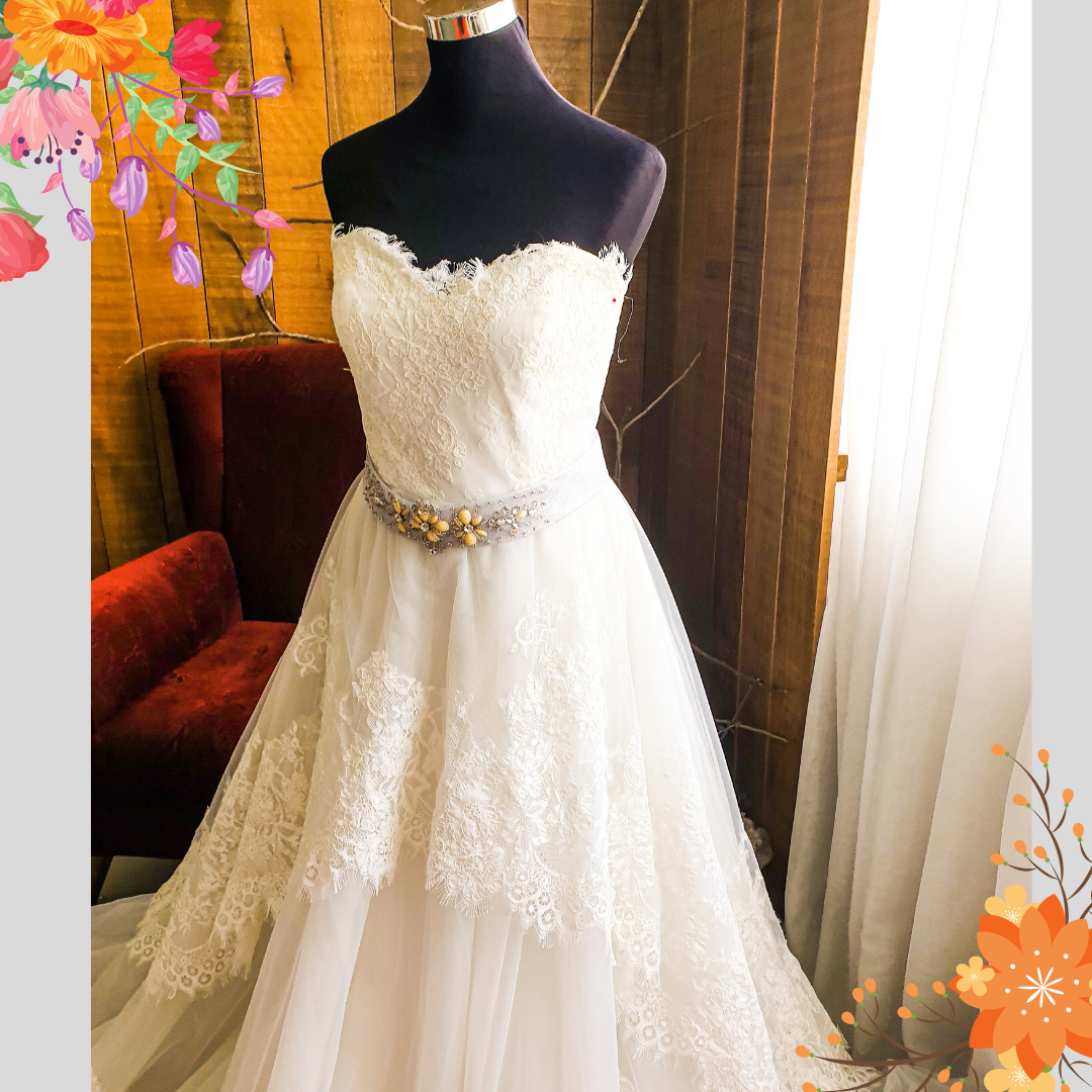 Featuring a beautiful lace embroidery with elegant beading details, this gorgeous wedding dress is both elegant and timeless!