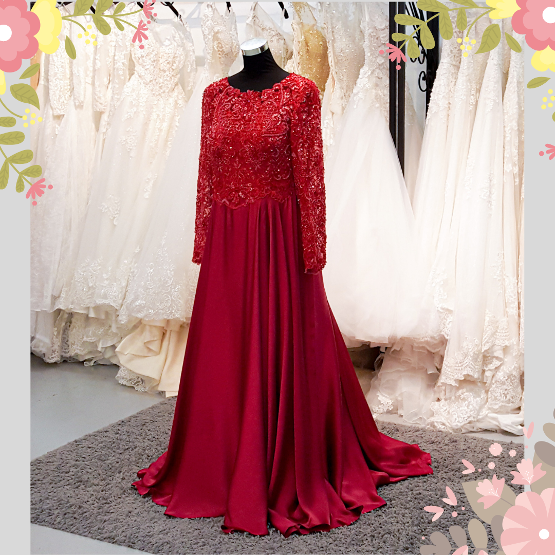 909LLEL01 Umie Maroon LS Chiffon Lace 2 Long Sleeves Wedding Dress Rental Kuala Lumpur, French Lace wedding Dress rental Malaysia,