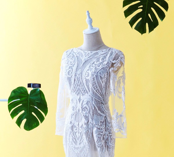The dress is sheer thus is perfect for pre-wedding photography shoot. It can also be worn with a silk satin lining for demure look.