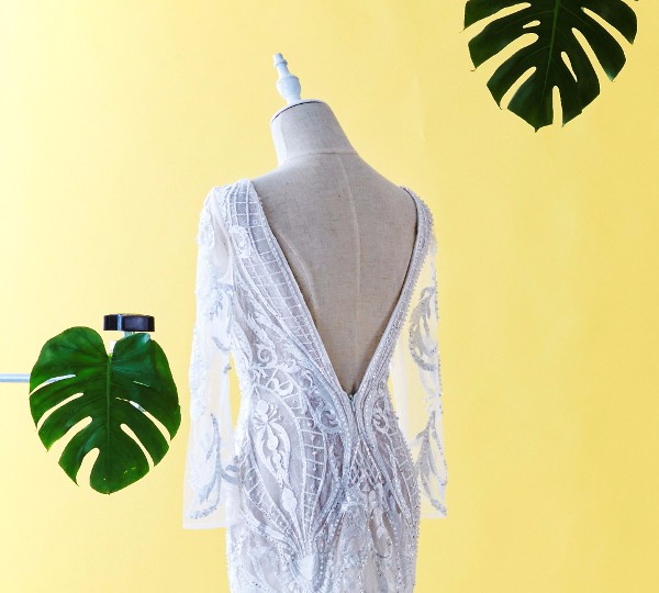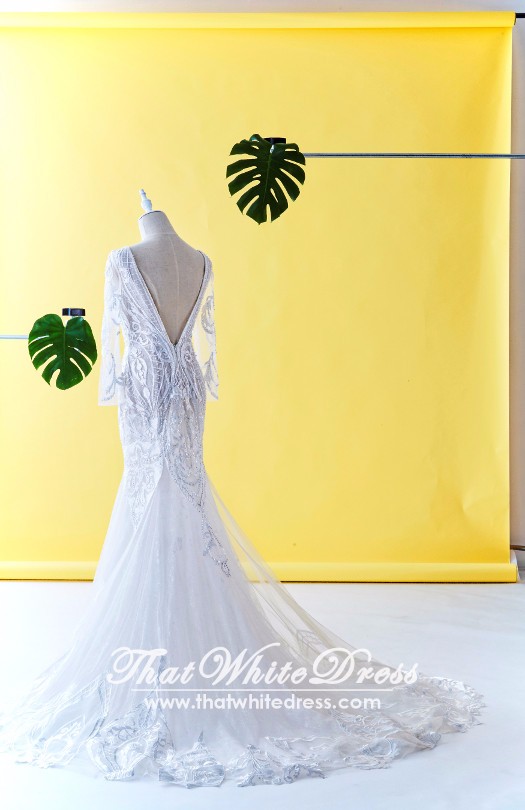 Long sleeves weding dress in trumpet fully embroidered in luscious Spanish lace. Sexy low back details with a detachable back cover to convert it into a conservative covered back dress suitable for church wedding or muslimah wedding/majlis perkahwinan.