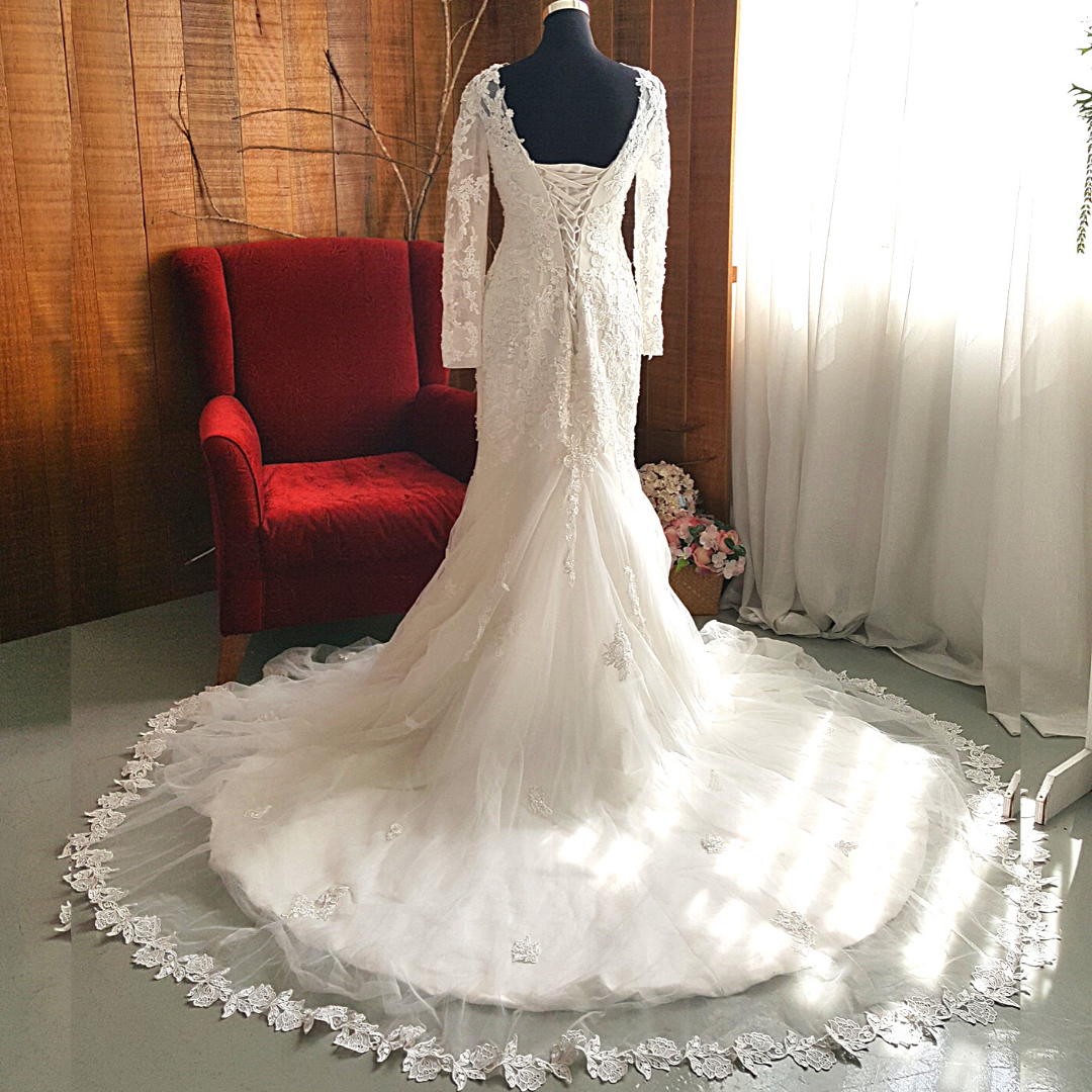 Long sleeves wedding dress in elegant mermaid/trumpet style. Featuring beautiful French embroidered floral lace with swarovski crystals.