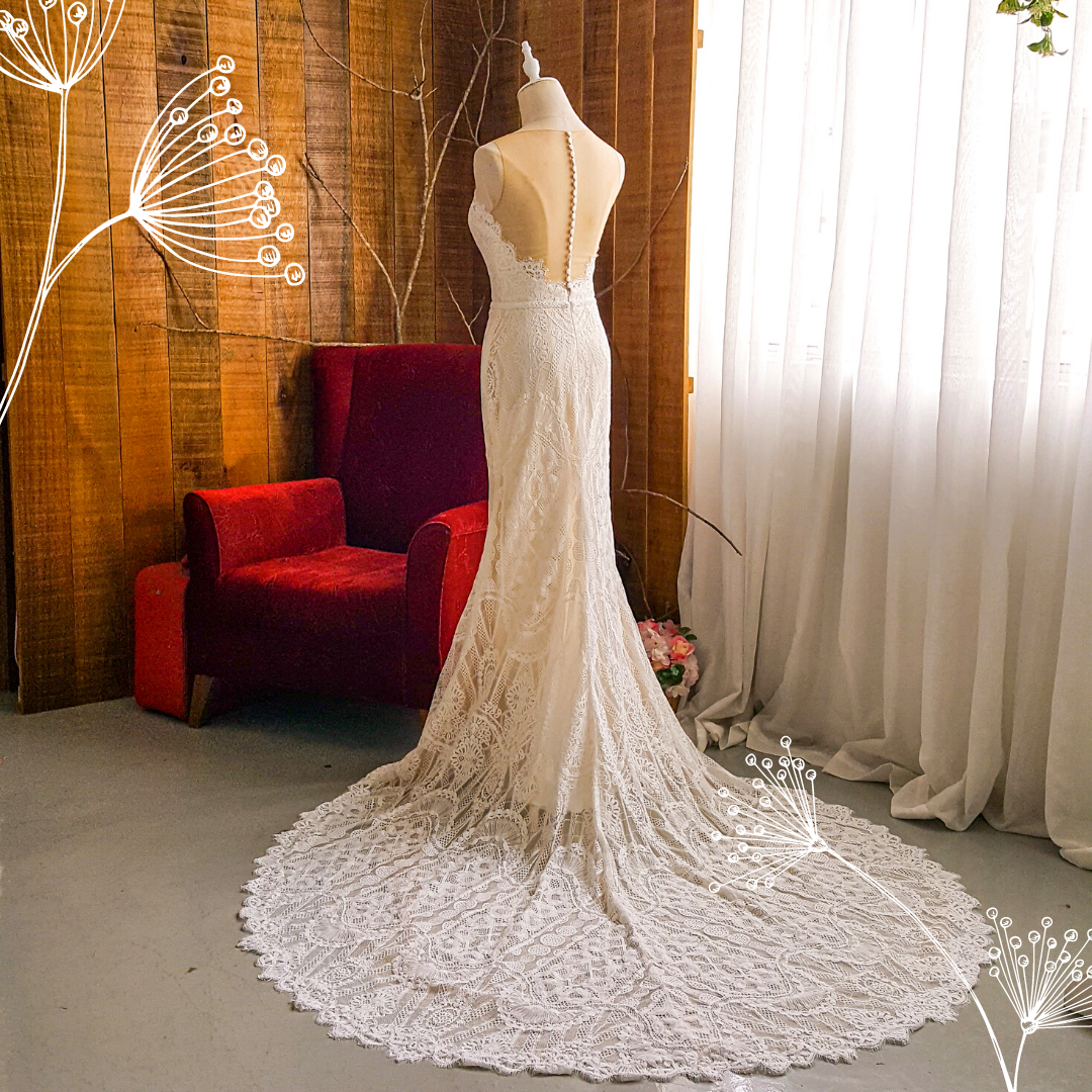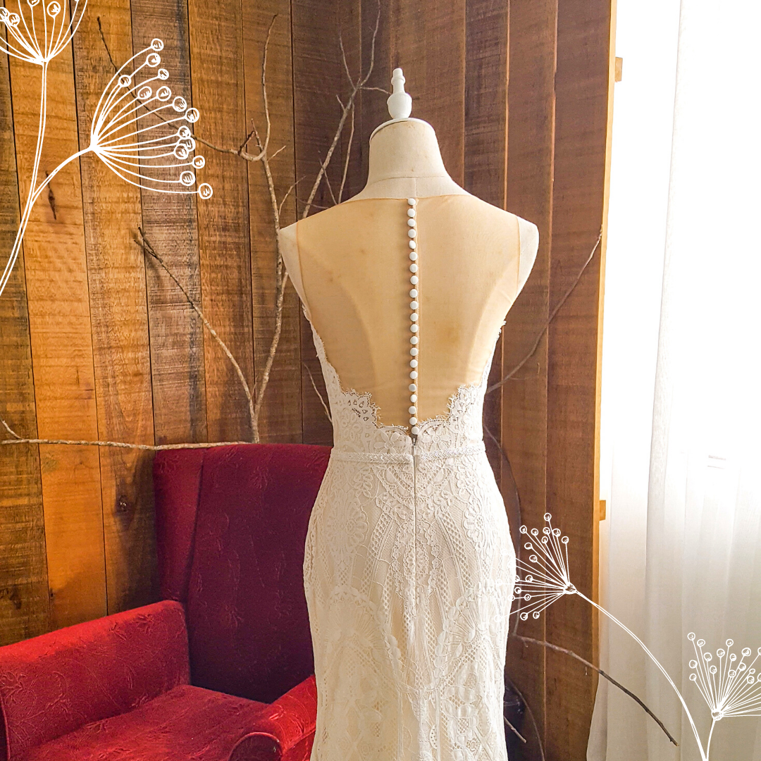 Gorgeous illusion neckline wedding dress in beautiful French Baroque Chantilly lace.